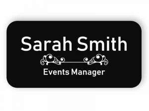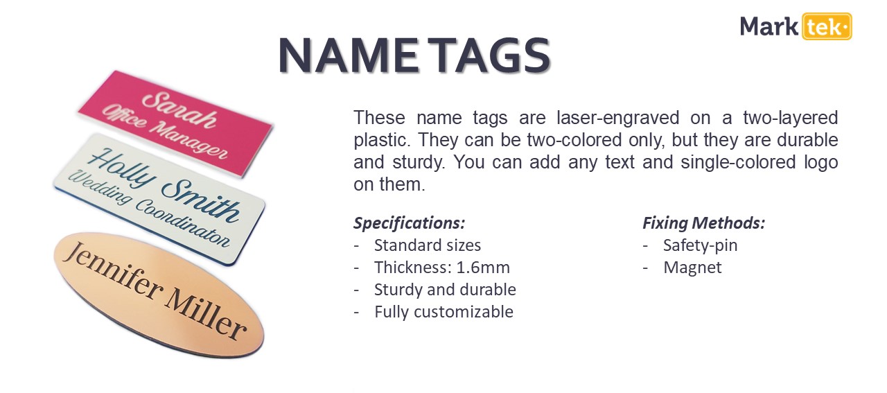 These name tags are laser cut and engraved; therefore, the text and images can only be single coloured. Wooden name tags have a dark brown colour on engraved areas; meanwhile, plastic name tags have the main colour of the top layer and the text and image colour of the bottom layer. All the possible colour combinations, as well as all other technical details, can be found in the Technical Details page below, as well as in the Sign Builder Tool.